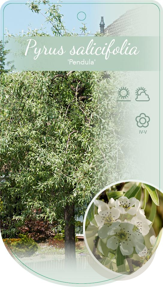 | Toelichting | De Treursierpeer (Pyrus salicifolia 'Pendula') is een prachtige sierpeer met hangende takken en zilvergrijs blad. In het voorjaar bloeit deze boom met witte bloemen en gedijt het best in de volle zon op zandgrond of lichte klei. |