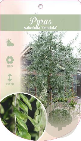 | Toelichting | De Treursierpeer (Pyrus salicifolia 'Pendula') is een prachtige sierpeer met hangende takken en zilvergrijs blad. In het voorjaar bloeit deze boom met witte bloemen en gedijt het best in de volle zon op zandgrond of lichte klei. |