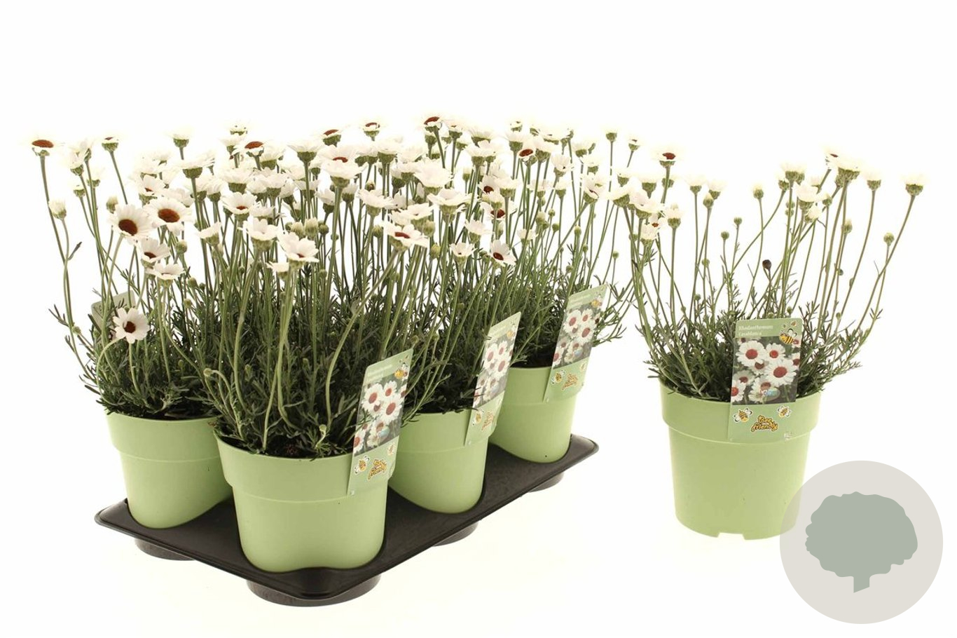 | Toelichting | De Kamillebloem (Rhodanthemum White) is een prachtige plant met witte bloemen en groen blad. Deze plant bloeit van mei tot september en gedijt het beste in de zon op zandgrond, neutrale grond of goede tuingrond. |