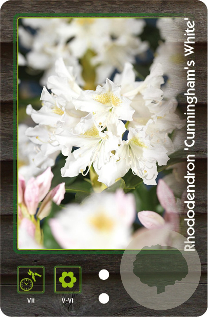 | Toelichting | De Rhododendron 'Cunningham's White' is een prachtige struik met donkergroene bladeren en witte bloemen in de periode mei-juni. Deze niet-inheemse plant gedijt het beste in halfschaduw op zure en humusrijke grond. |