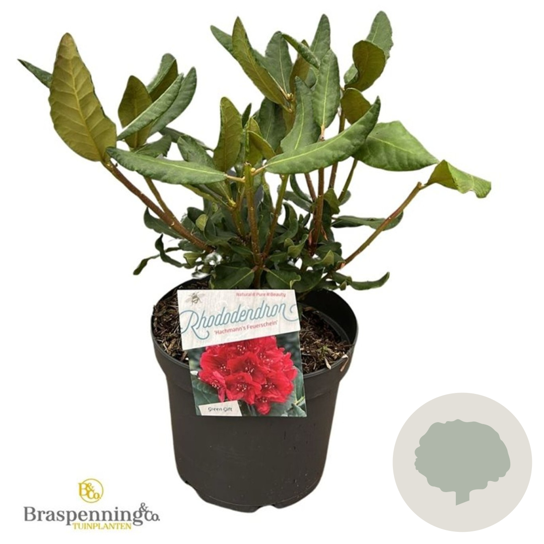 | Toelichting | De Rhododendron 'Hachmann's Feuerschein' is een prachtige struik met rode bloemen die bloeien in mei en juni. De plant wordt ongeveer 150 cm hoog en gedijt goed in halfschaduw op zure, humusrijke grond. |