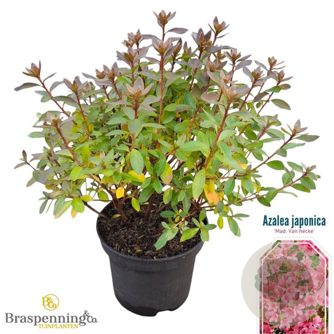 | Toelichting | De Rhododendron 'Madame van Hecke' is een prachtige struik met roze bloemen die bloeien in mei en juni. De plant wordt ongeveer 150 cm hoog en gedijt het beste in halfschaduw op zure, humusrijke grond. |