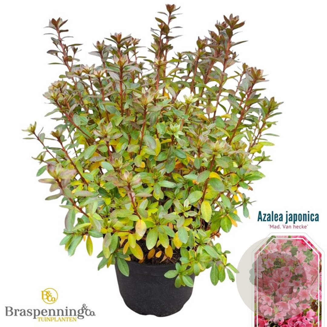 | Toelichting | De Rhododendron 'Madame van Hecke' is een prachtige struik met roze bloemen die bloeien in mei en juni. De plant wordt ongeveer 150 cm hoog en gedijt het beste in halfschaduw op zure, humusrijke grond. |