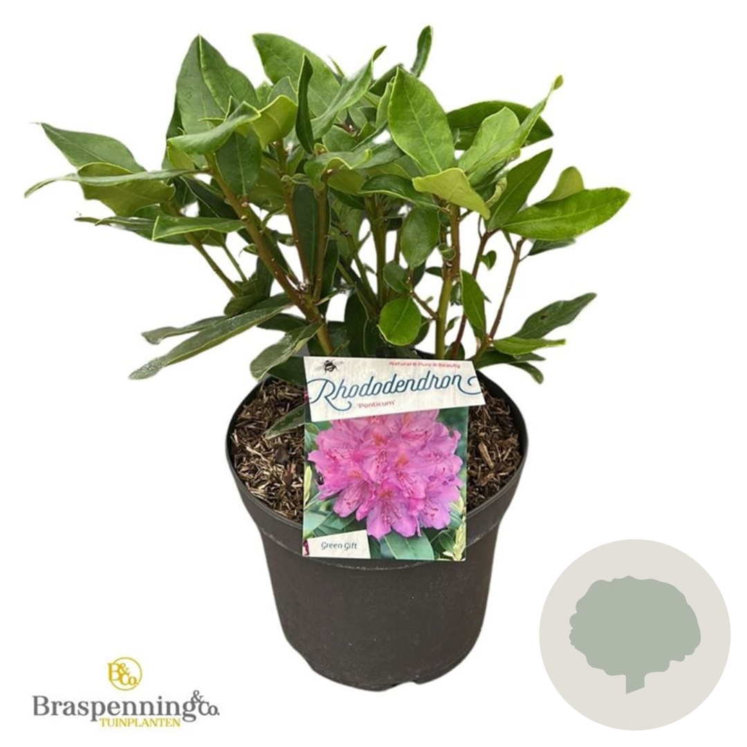 Toelichting | De Rhododendron is een prachtige heester met roze en paarse bloemen die bloeit in april en mei. Deze niet-inheemse plant gedijt goed in de halfschaduw op zure en humusrijke grond, en bereikt een hoogte van 200 cm. |