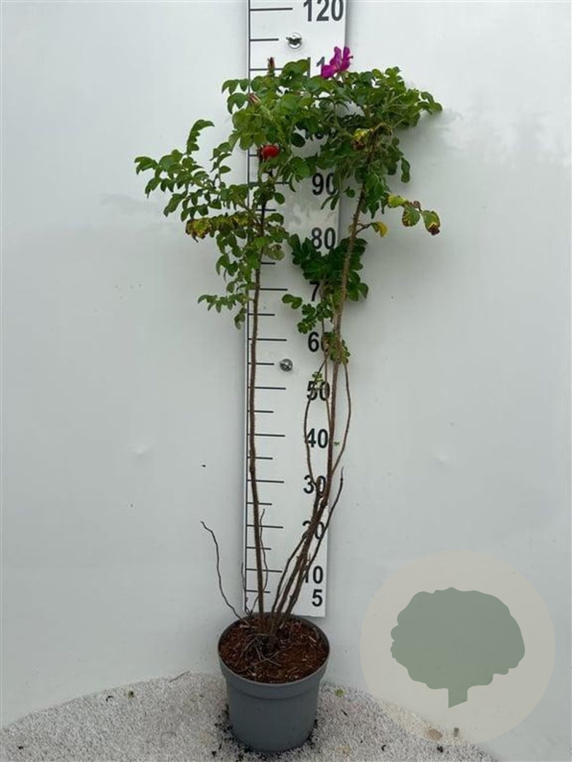 | Toelichting | De Rosa rugosa 'Rubra', ook wel bekend als de Rimpelroos, is een prachtige struik met rode bloemen en groen blad. Deze roos bloeit van juni tot september en gedijt goed in zonnige tot halfschaduwrijke plekken met zandgrond, lichte klei of neutrale grond. |