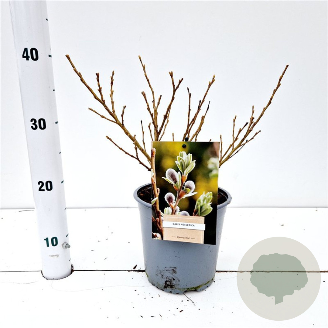 | Toelichting | De Alpenwilg (Salix helvetica) is een sierlijke struik met geelgroene bloemen in maart - april. Deze plant gedijt goed in zon en halfschaduw op zandgrond, lichte klei of neutrale grond. Bereikt een hoogte van 150 cm en heeft groen blad. |