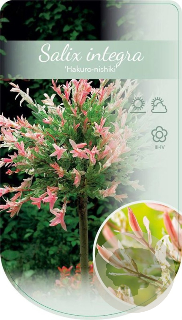 | Toelichting | De bonte wilg (Salix integra 'Hakuro-nishiki') is een prachtige struik met groen en roze blad. In maart en april bloeit de plant met gele bloemen. Deze wilg gedijt goed in zon en halfschaduw op zandgrond, lichte klei of neutrale grond. |