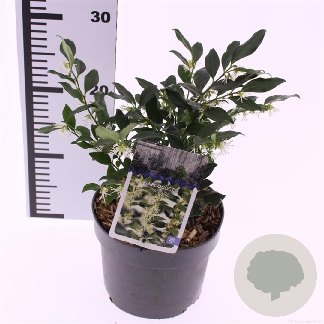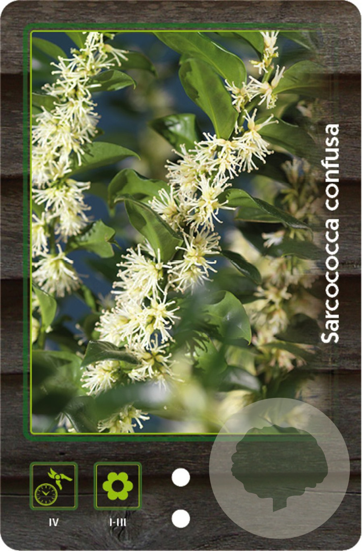 | Toelichting | De Sarcococca confusa, ook wel bekend als Vleesbes, is een wintergroene struik met geurende witte bloemen in de vroege lente. Deze plant gedijt goed in de schaduw op zure en humusrijke grond, en heeft een volwassen hoogte van ongeveer 60 cm. |