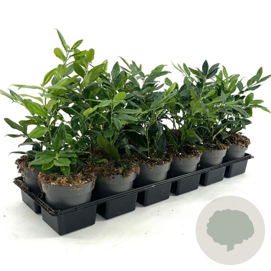 | Toelichting | De Sarcococca confusa, ook wel bekend als Vleesbes, is een wintergroene struik met geurende witte bloemen in de vroege lente. Deze plant gedijt goed in de schaduw op zure en humusrijke grond, en heeft een volwassen hoogte van ongeveer 60 cm. |