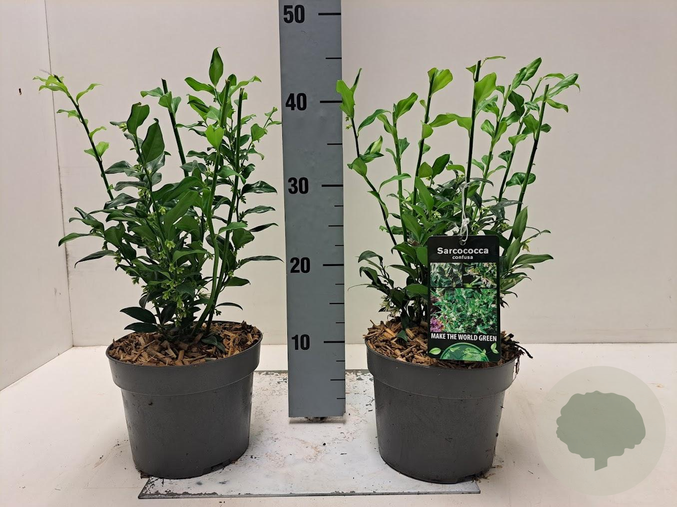 | Toelichting | De Sarcococca confusa, ook wel bekend als Vleesbes, is een wintergroene struik met geurende witte bloemen in de vroege lente. Deze plant gedijt goed in de schaduw op zure en humusrijke grond, en heeft een volwassen hoogte van ongeveer 60 cm. |