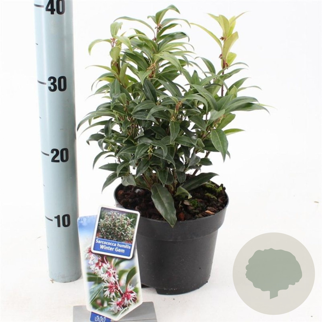 | Toelichting | De Vleesbes Winter Gem is een compacte struik met donkergroen blad en geurende witte bloemen in de winter. Perfect voor schaduwrijke plekken met zure en humusrijke grond. Bereikt een hoogte van 40 cm en bloeit van januari tot maart. |