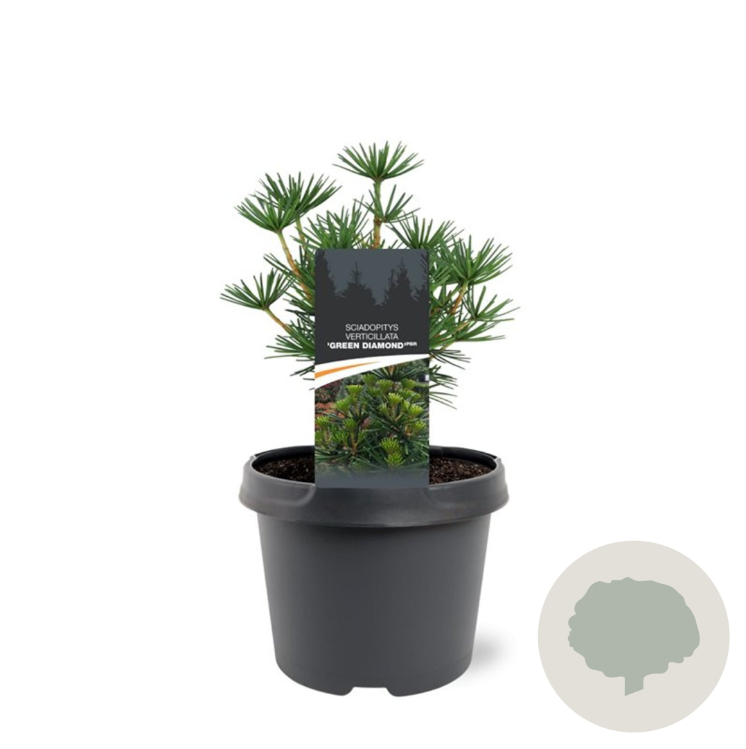 | Toelichting | De Japanse parasolden (Sciadopitys vert. Green Diamond) is een prachtige conifeer met donkergroene naalden en gele bloemen in mei - juni. Deze sierlijke boom gedijt goed in zon en halfschaduw op zandgrond, neutrale grond of goede tuingrond. |