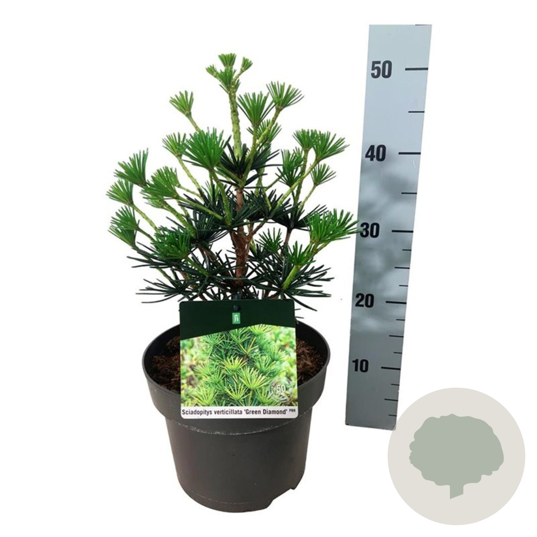 ToelichtingDe Japanse parasolden (Sciadopitys vert. Green Diamond) is een prachtige conifeer met donkergroene naalden en gele bloemen in mei - juni. Deze sierlijke boom gedijt goed in zon en halfschaduw op zandgrond, neutrale grond of goede tuingrond.