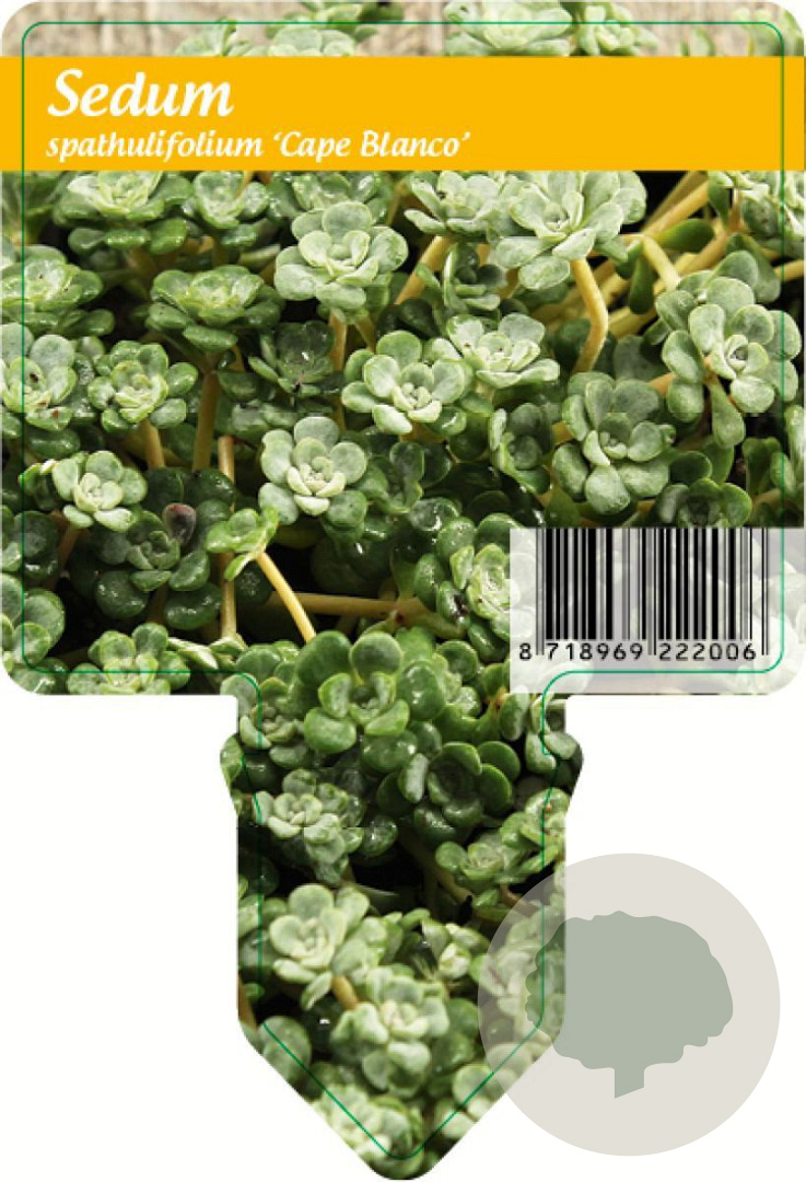 | Toelichting | Sedum spathulifolium 'Cape Blanco' is een laagblijvende vetplant met groene bladeren en gele bloemen. Deze Sedum bloeit in de zomermaanden en gedijt goed in de volle zon op zandgrond. Perfect voor een zonnige border of rotstuin. |