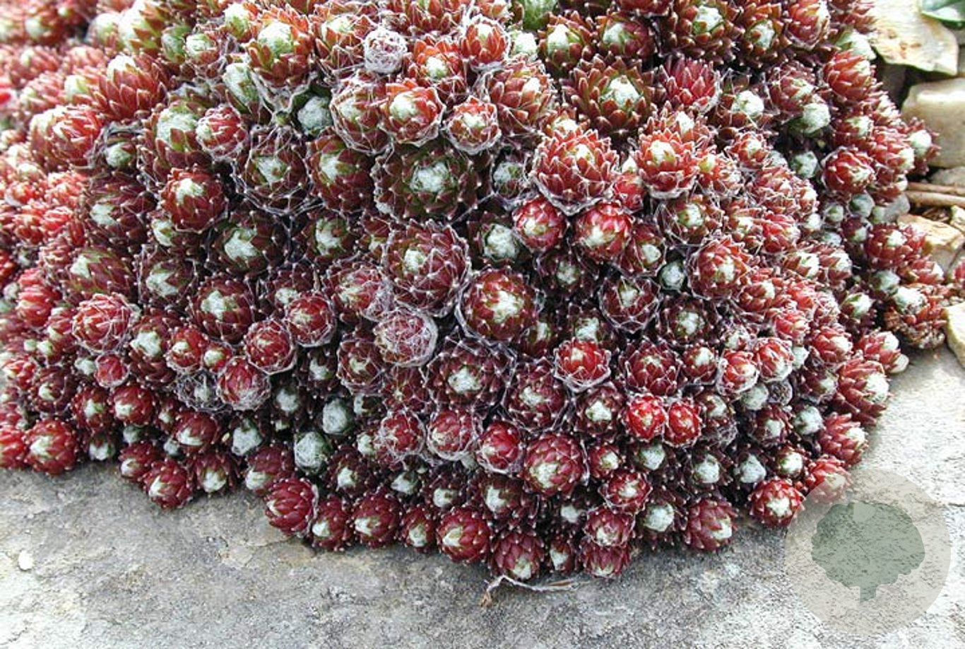 | Toelichting | Huislook (Sempervivum arachn. 'Rubrum') is een laagblijvende plant met roze bloemen en groen blad. Deze succulent bloeit in juni en juli en gedijt goed in de volle zon op zand-, klei- of neutrale grond. |