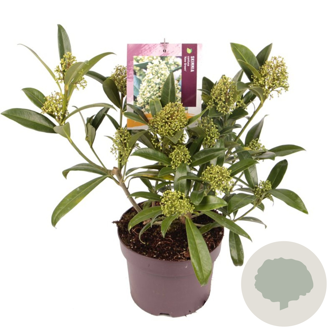 | Toelichting | Skimmia is een prachtige groenblijvende struik met donkergroene bladeren en witte bloemen in de lente. Perfect voor een halfschaduwrijke plek met zure, humusrijke grond. Bereikt een hoogte van 150 cm en bloeit in april - mei. |