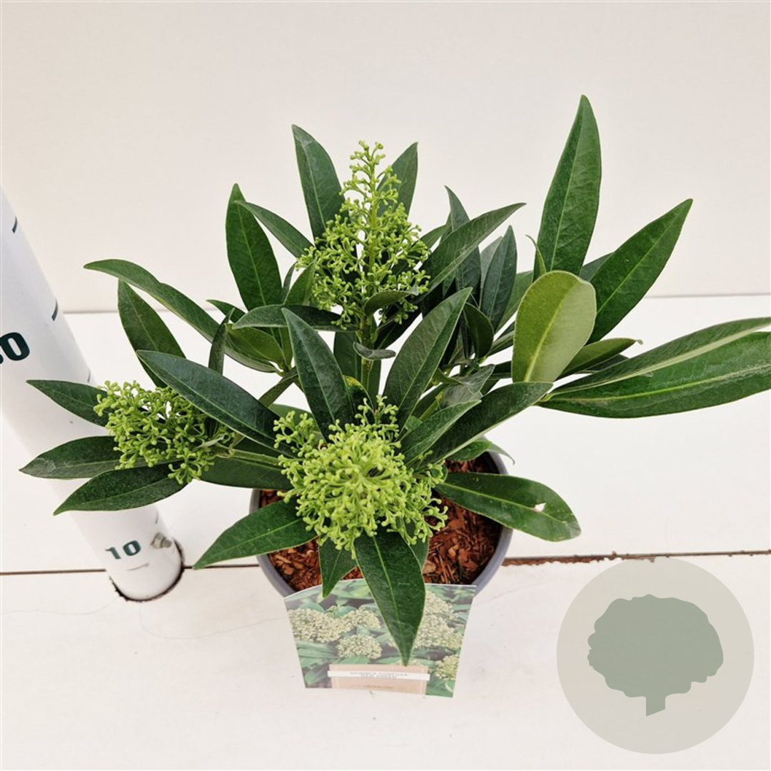 | Toelichting | Skimmia is een prachtige groenblijvende struik met donkergroene bladeren en witte bloemen in de lente. Perfect voor een halfschaduwrijke plek met zure, humusrijke grond. Bereikt een hoogte van 150 cm en bloeit in april - mei. |