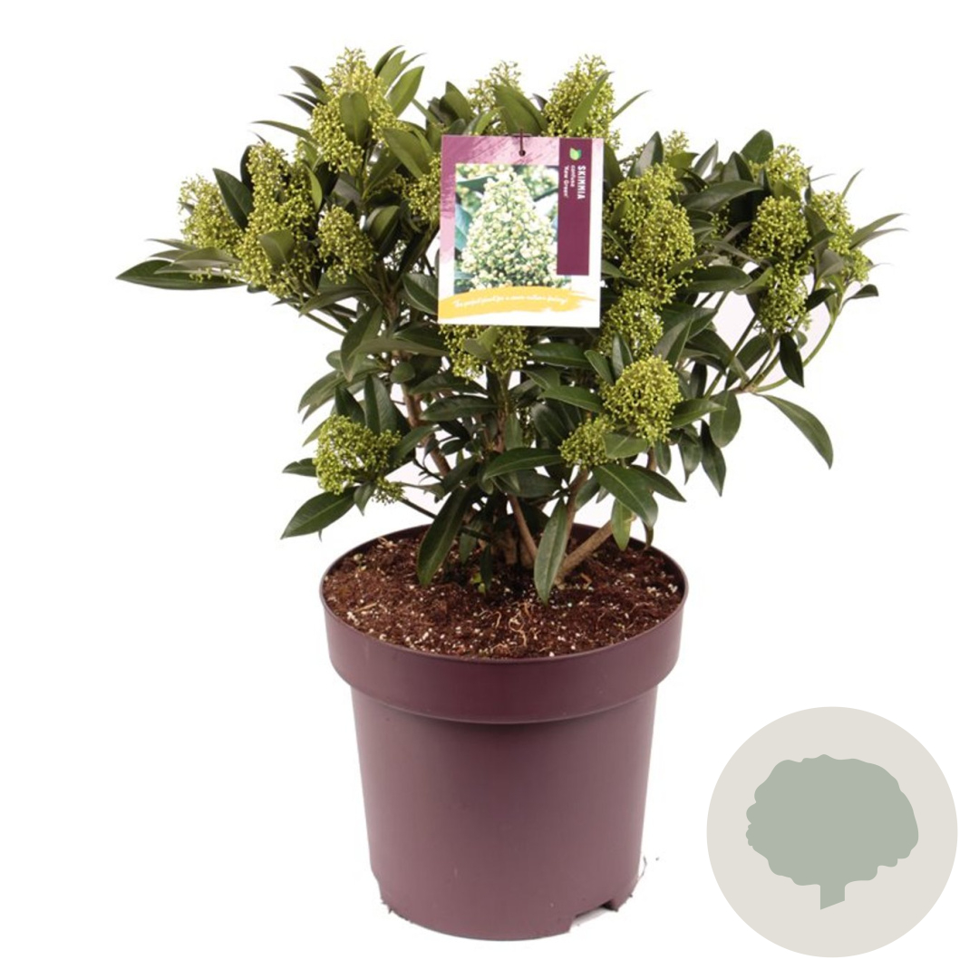 | Toelichting | Skimmia is een prachtige groenblijvende struik met donkergroene bladeren en witte bloemen in de lente. Perfect voor een halfschaduwrijke plek met zure, humusrijke grond. Bereikt een hoogte van 150 cm en bloeit in april - mei. |