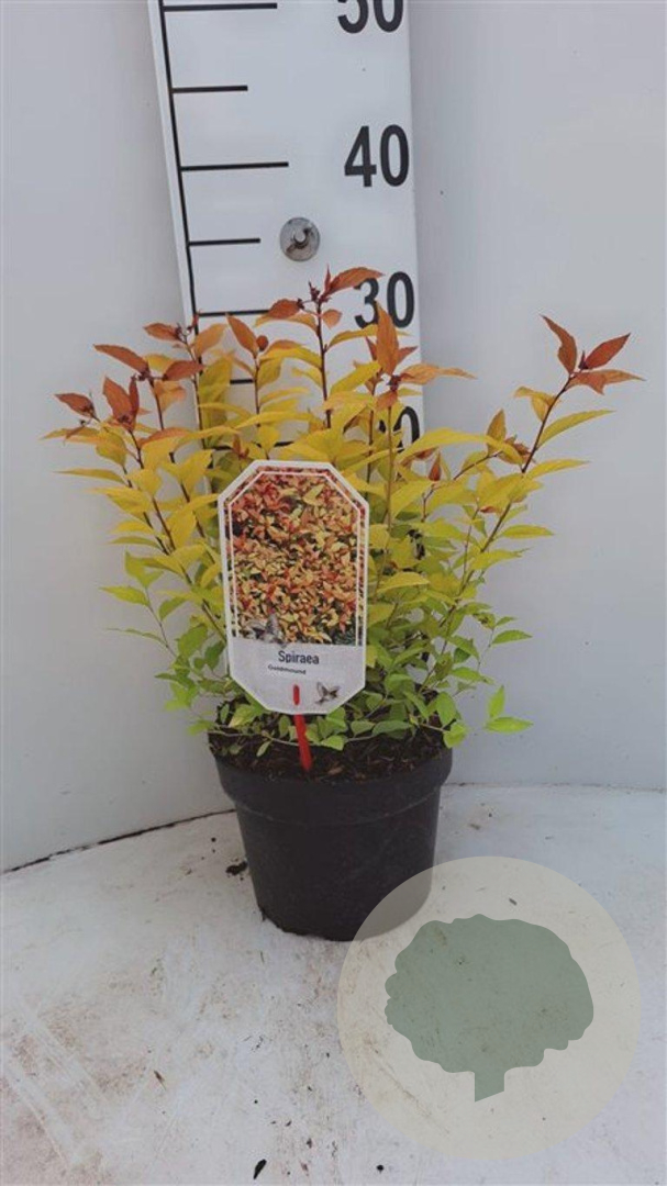 | Toelichting | Spiraea 'Goldmound' is een compacte struik met goudgeel blad en roze bloemen in de lente. Perfect voor zonnige tot halfschaduwrijke plekken met lichte klei en neutrale, voedselrijke grond. Bereikt een hoogte van 50 cm en bloeit in mei - juni. |