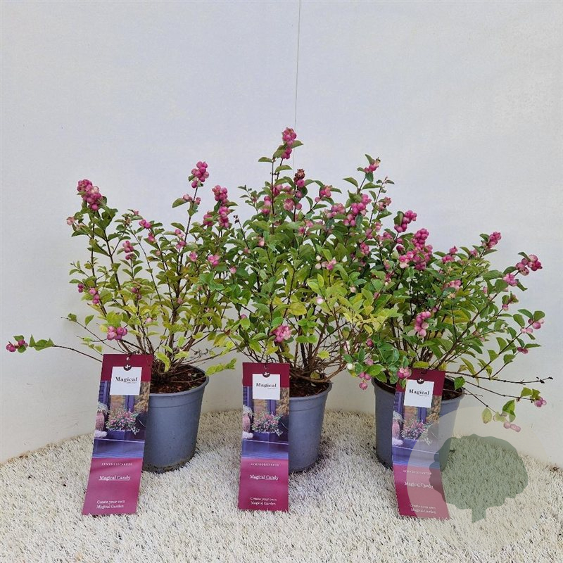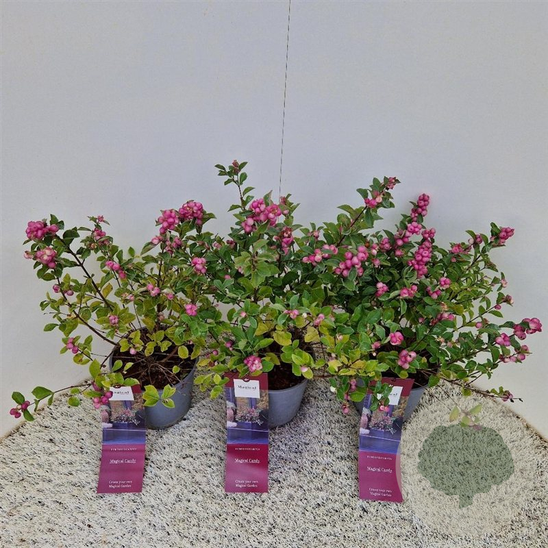 | Toelichting | De Symphoricarpos Magical Candy, ook wel bekend als Sneeuwbes, is een prachtige struik met roze bloemen en groen blad. Deze struik bloeit van juni tot augustus en gedijt goed in zon en halfschaduw op lichte klei, neutrale grond of goede tuingrond. |