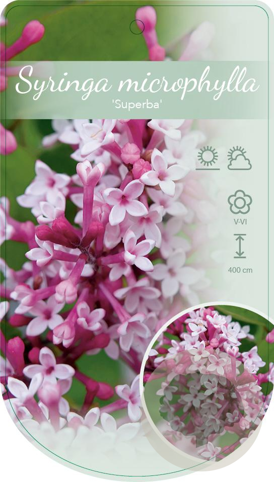 | Toelichting | De Dwergsering (Syringa microphylla 'Superba') is een prachtige heester met paarse bloemen die bloeien in mei en juni. Deze compacte struik wordt ongeveer 150 cm hoog en gedijt goed in zonnige tot halfschaduwrijke plekken met lichte klei en neutrale grond. |