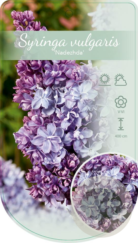 | Toelichting | De Sering 'Nadezhda' is een prachtige sierheester met paarse bloemen die bloeien in mei en juni. Deze struik wordt ongeveer 200 cm hoog en gedijt goed in zonnige tot halfschaduwrijke plekken met lichte klei, neutrale en voedselrijke grond. |