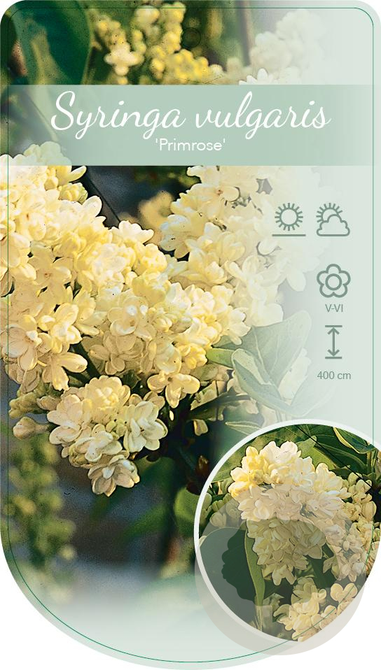 | Toelichting | De Sering 'Primrose' is een prachtige sierheester met geurende gele bloemen in de periode mei-juni. Deze struik kan een hoogte bereiken van 200 cm en gedijt het beste in de zon of halfschaduw op neutrale, goede tuingrond met humus. |