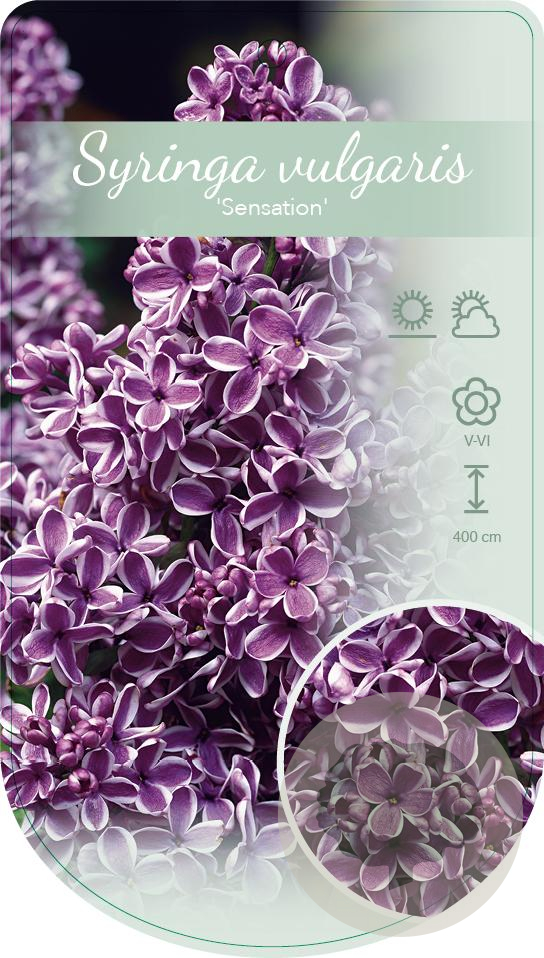 | Toelichting | De Sering 'Sensation' is een prachtige struik met paars-witte bloemen in de periode mei-juni. De struik kan een hoogte bereiken van 300 cm en gedijt het beste in de volle zon op neutrale, goede tuingrond met humus. |