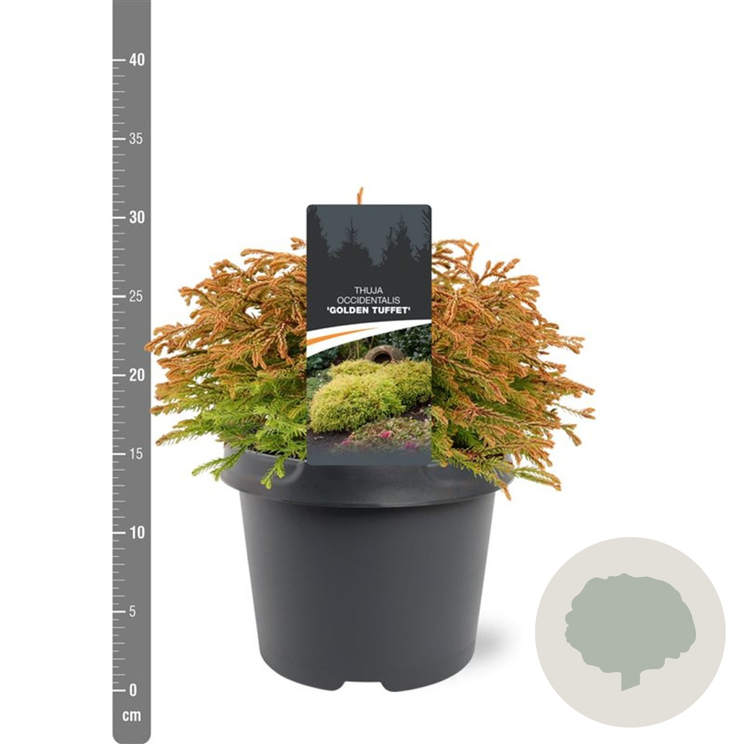 ToelichtingDe Westerse Levensboom 'Golden Tuffet' is een compacte conifeer met opvallend geel blad. Deze langzaam groeiende plant bereikt een hoogte van 100 cm en gedijt goed in zonnige tot halfschaduwrijke omgevingen met zandgrond, lichte klei of neutrale grond. Bloeit niet, maar het gele blad zorgt voor kleur in de tuin in mei - juni.