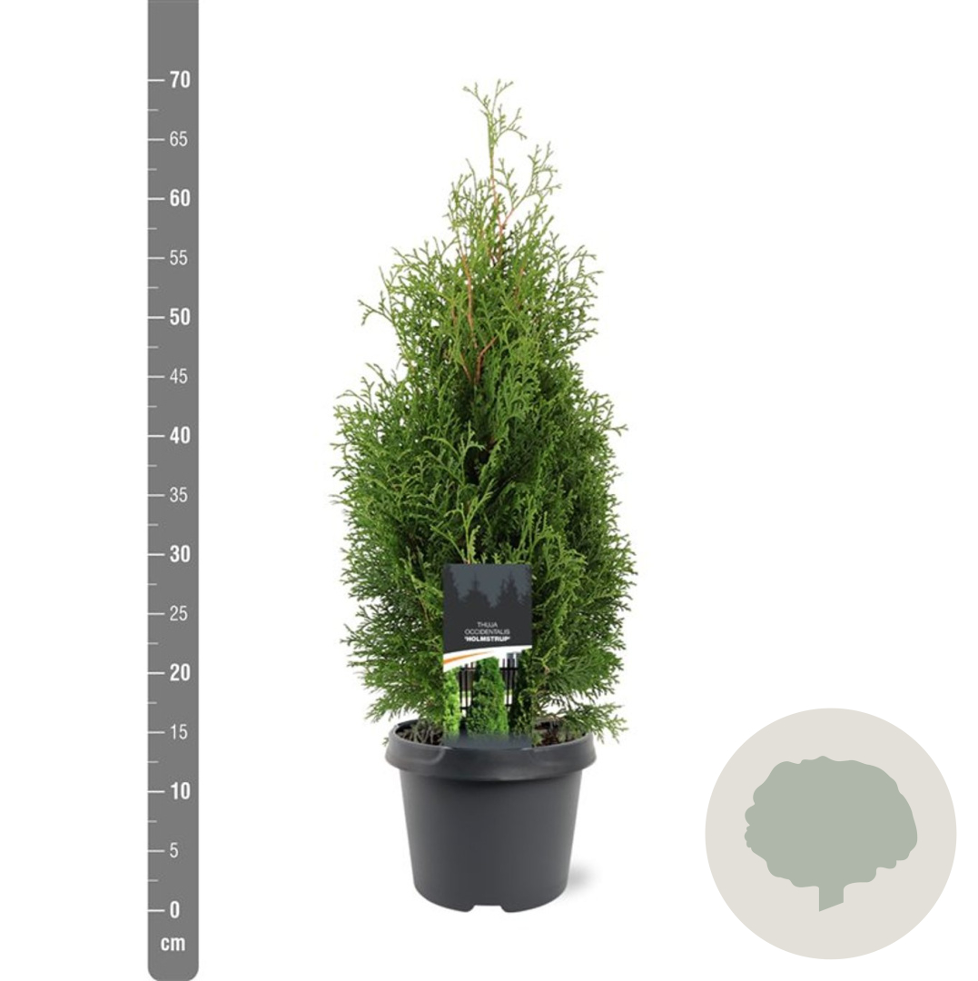 | Toelichting | De Westerse Levensboom 'Holmstrup' is een compacte conifeer met donkergroen blad. Deze sierlijke boom kan een hoogte bereiken van 300 cm en gedijt goed in zon en halfschaduw op zandgrond, klei of neutrale grond. |