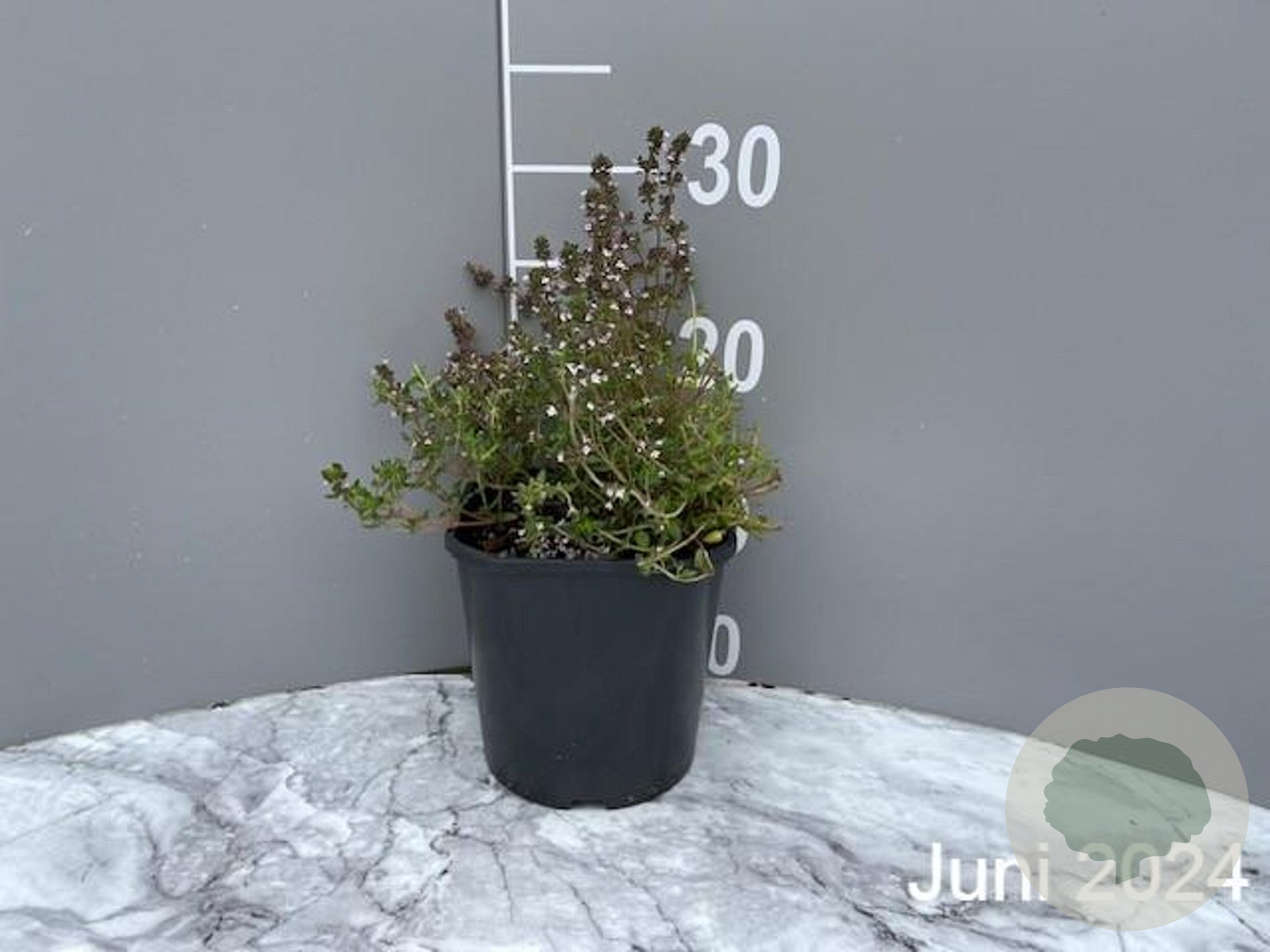 | Toelichting | Tijm (Thymus vulgaris) is een aromatische kruidenplant met paarse bloemen en groen blad. Deze plant bloeit van juni tot augustus en gedijt het beste in zonnige, goed doorlatende zand- en kalkrijke grond. Ideaal voor in de kruidentuin! |
