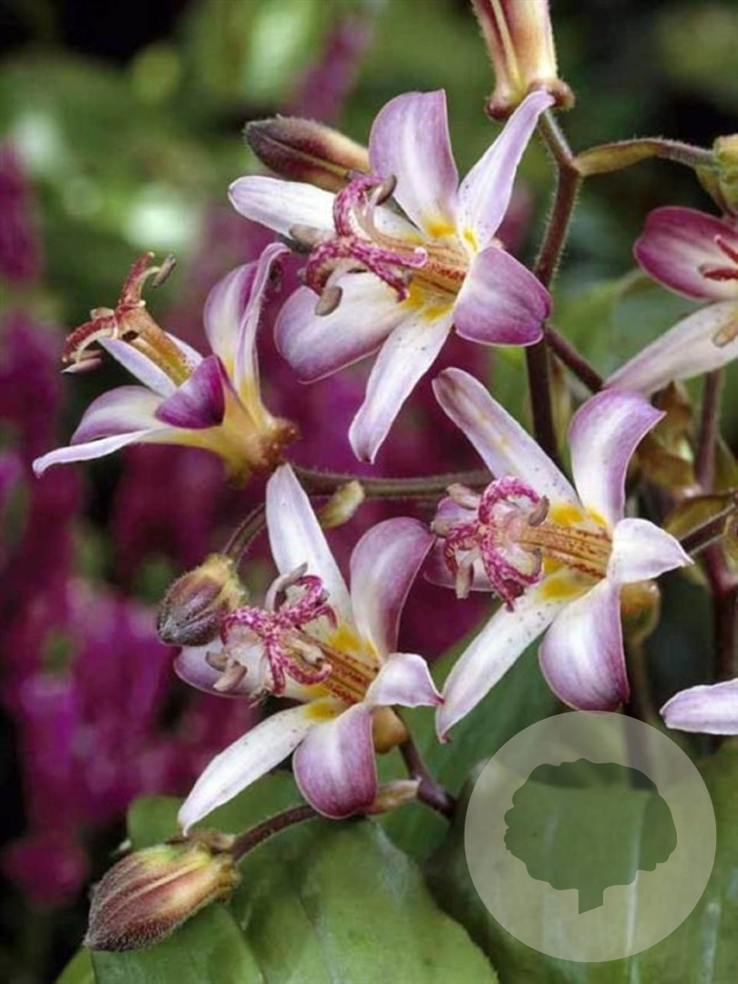 | Toelichting | Tricyrtis 'Tojen', ook bekend als Karmozijnbes, bloeit in augustus en september met paarse en witte bloemen op groen blad. Deze plant gedijt goed in halfschaduw op zure en humusrijke grond. |