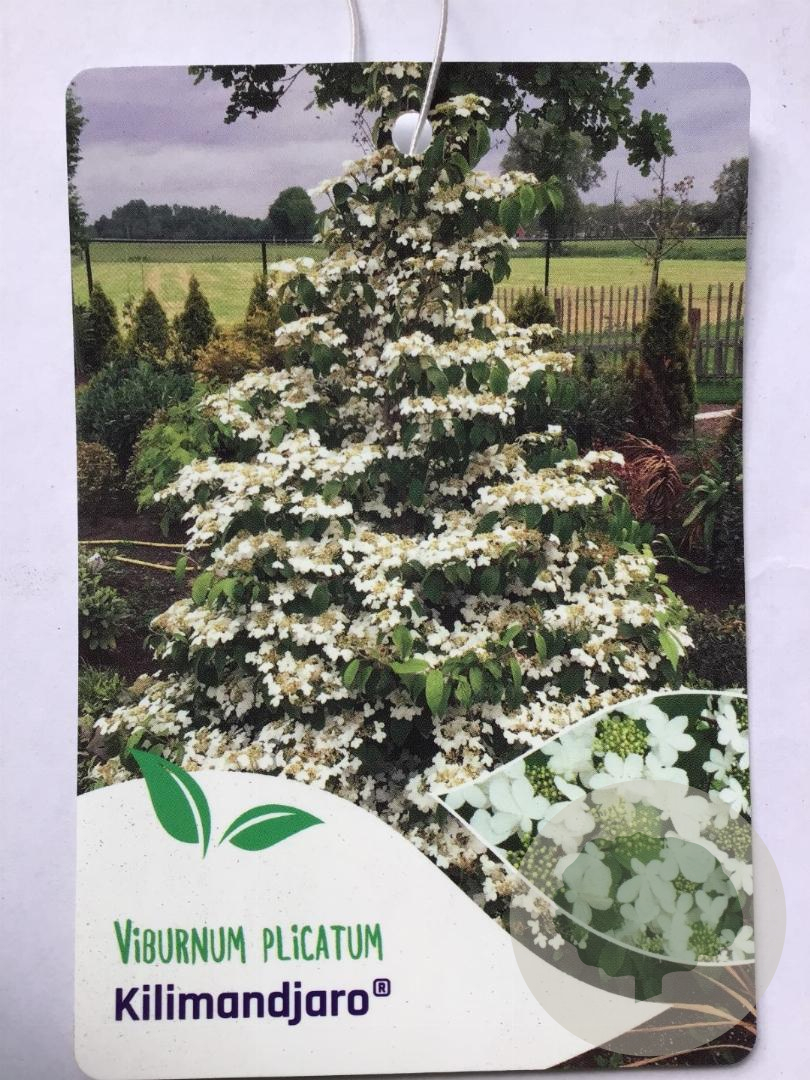 | Toelichting | De Viburnum plic. Kilimandjaro, ook wel bekend als Sneeuwbal, is een prachtige heester met witte bloemen in de lente. Deze plant wordt ongeveer 200 cm hoog en gedijt goed in zonnige tot halfschaduwrijke omgevingen met voedselrijke, neutrale grond. |