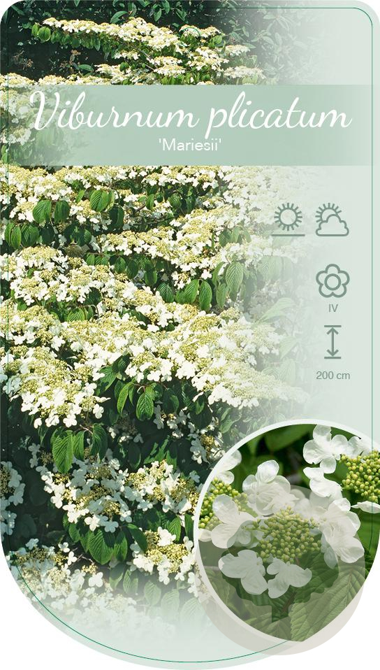 | Toelichting | De Sneeuwbal 'Mariesii' is een prachtige struik met witte bloemen in de periode mei-juni. De plant wordt ongeveer 200 cm hoog en gedijt goed in zon en halfschaduw op lichte klei, zure of humusrijke grond. |
