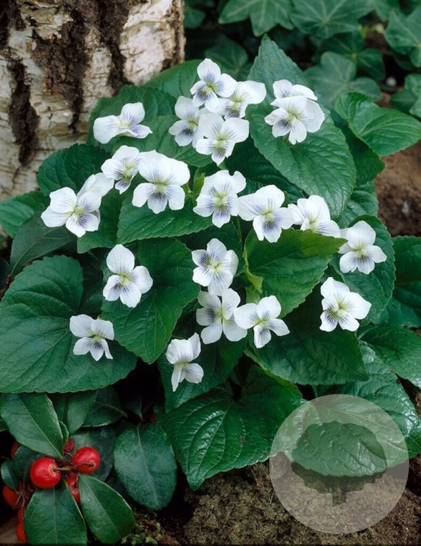 | Toelichting | Het Wilde viooltje (Viola sororia 'Albiflora') is een inheemse plant met witte bloemen en groen blad. Deze vaste plant bloeit van april tot juni en gedijt goed in de halfschaduw op lichte klei en humusrijke grond. Bereikt een hoogte van 15 cm. |