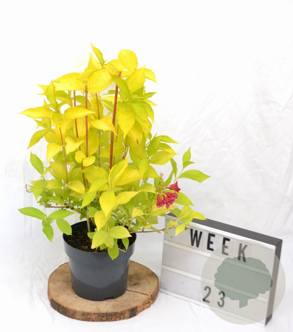 | Toelichting | Weigela is een prachtige struik met opvallende roze bloemen en geel blad. Bloeit in mei-juni en gedijt goed in zon en halfschaduw op neutrale, voedselrijke grond. Bereikt een hoogte van 150 cm en is een aanwinst voor elke tuin. |
